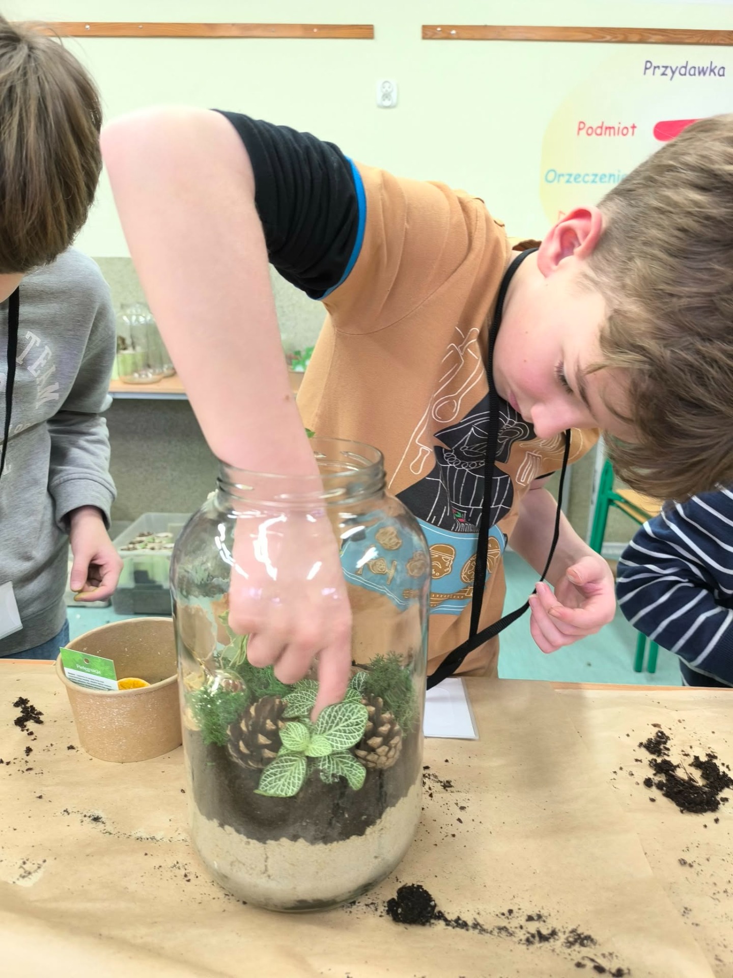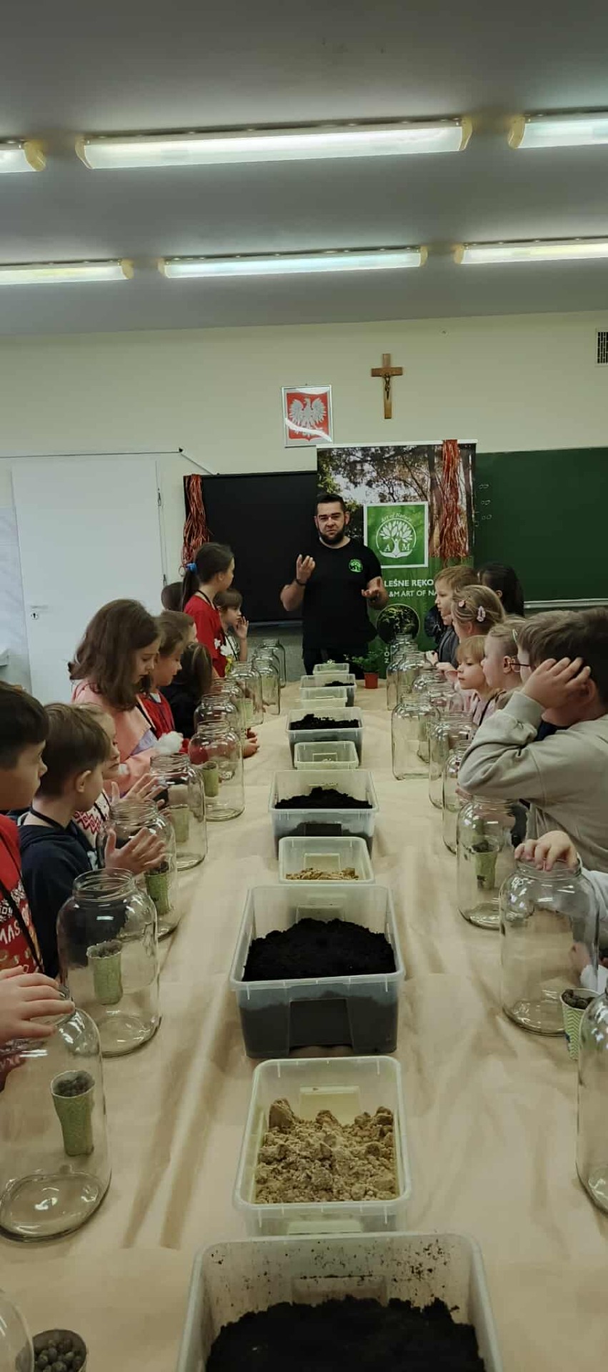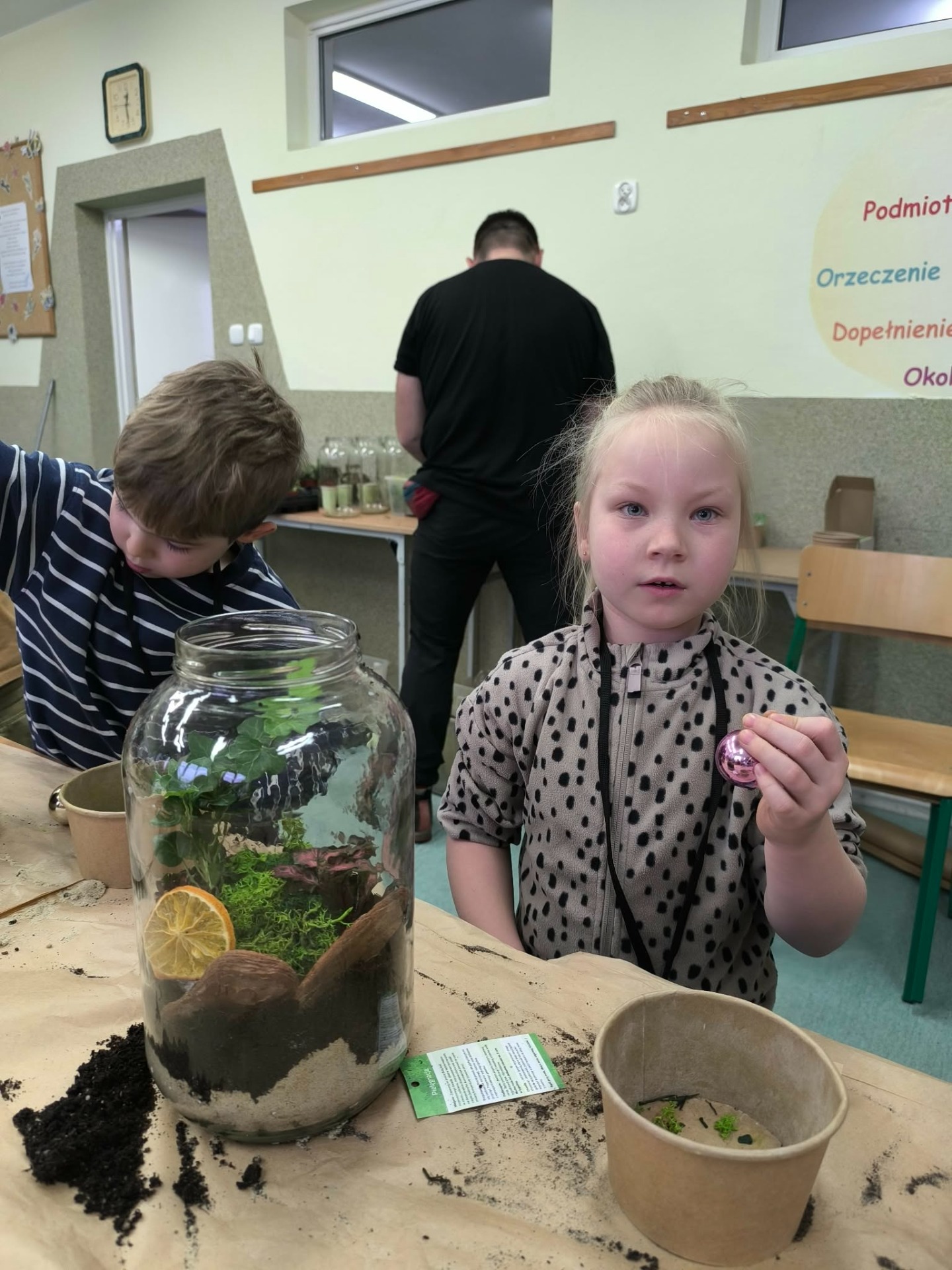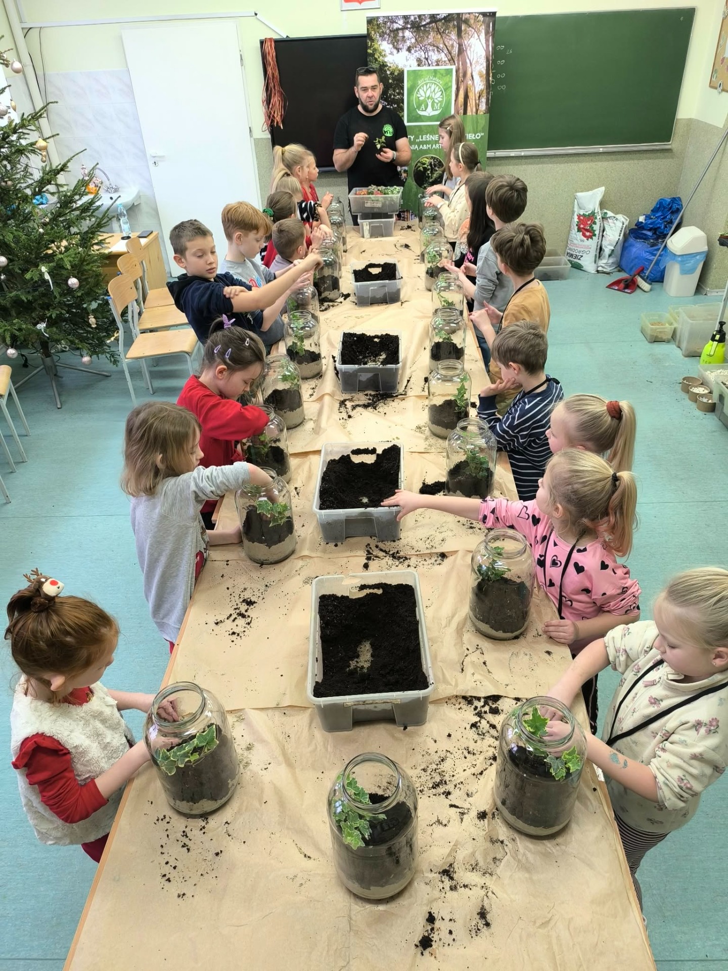 Drugą częścią spotkania stanowiły warsztaty „Las w słoiku”, podczas których uczestnicy stworzyli własne miniaturowe ekosystemy. Dzieci dowiedziały się, jak funkcjonuje las, dlaczego rośliny są tak ważne i jak dbać o przyrodę w codziennym życiu.