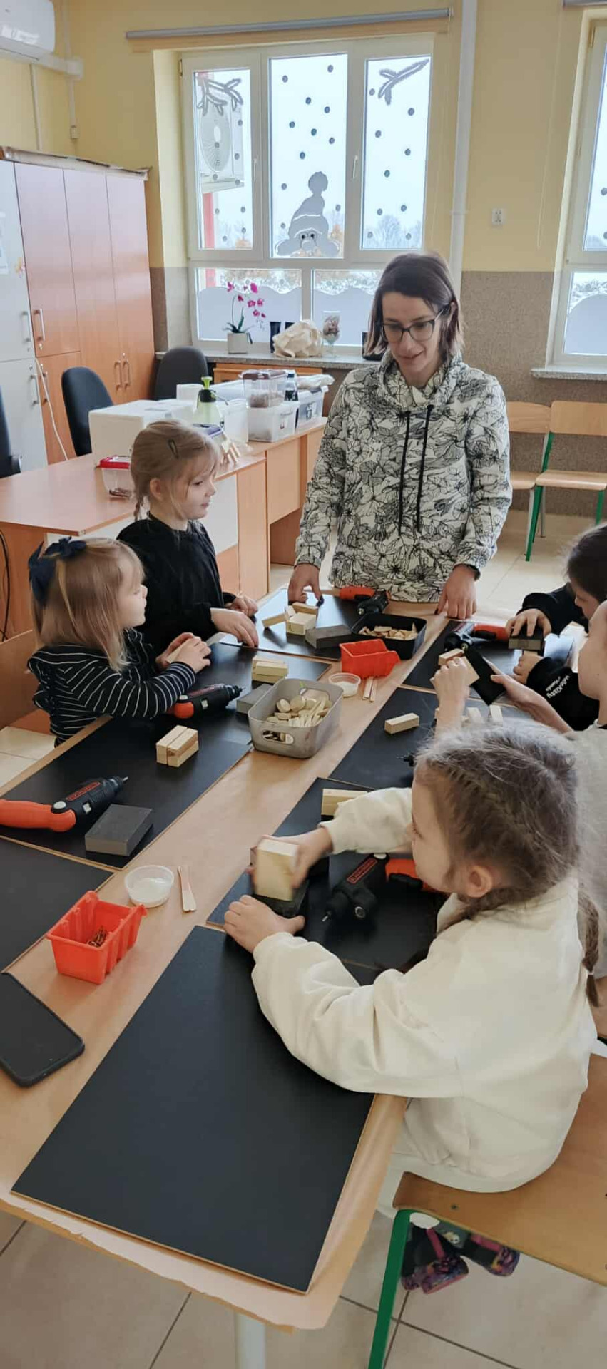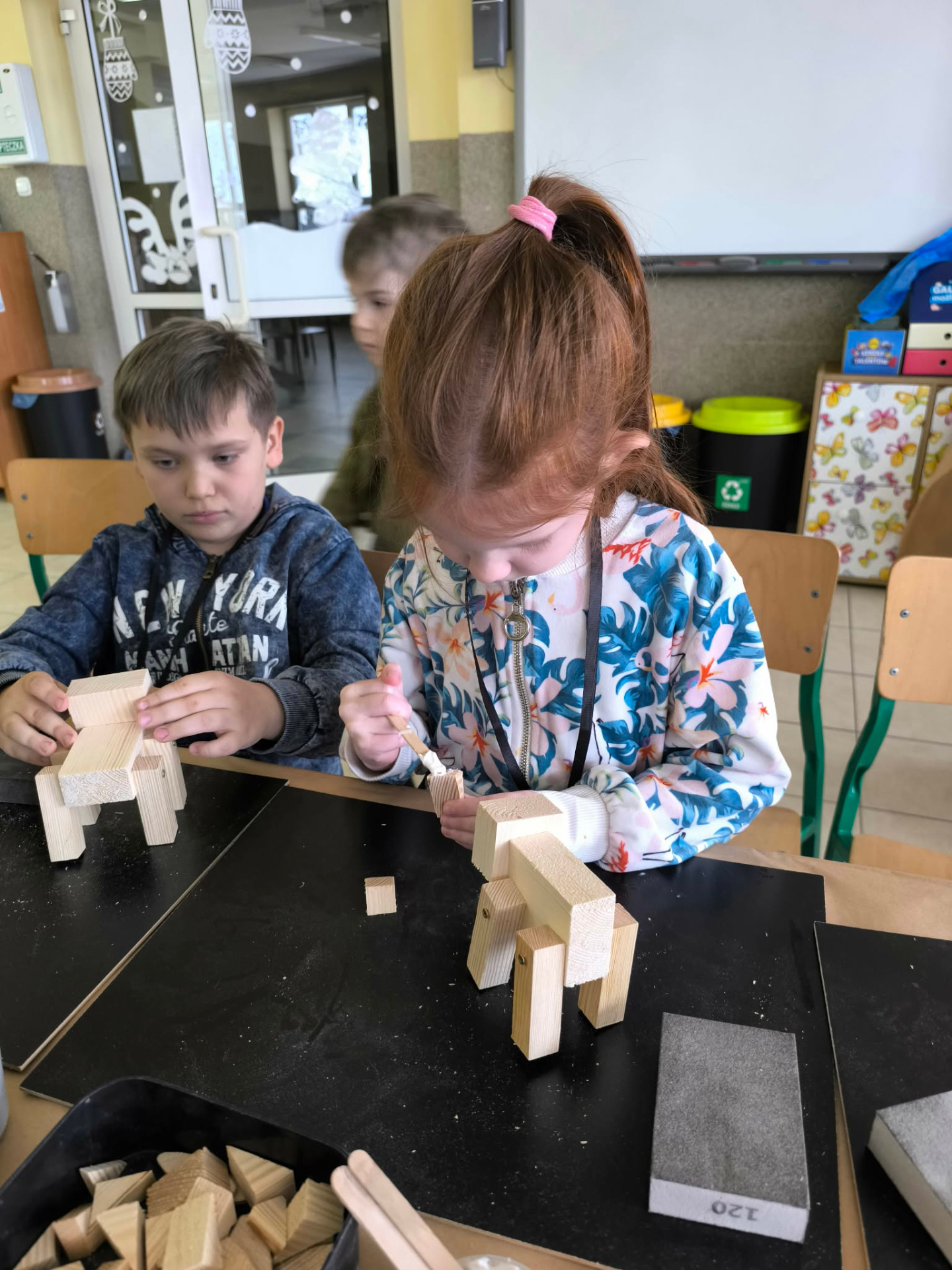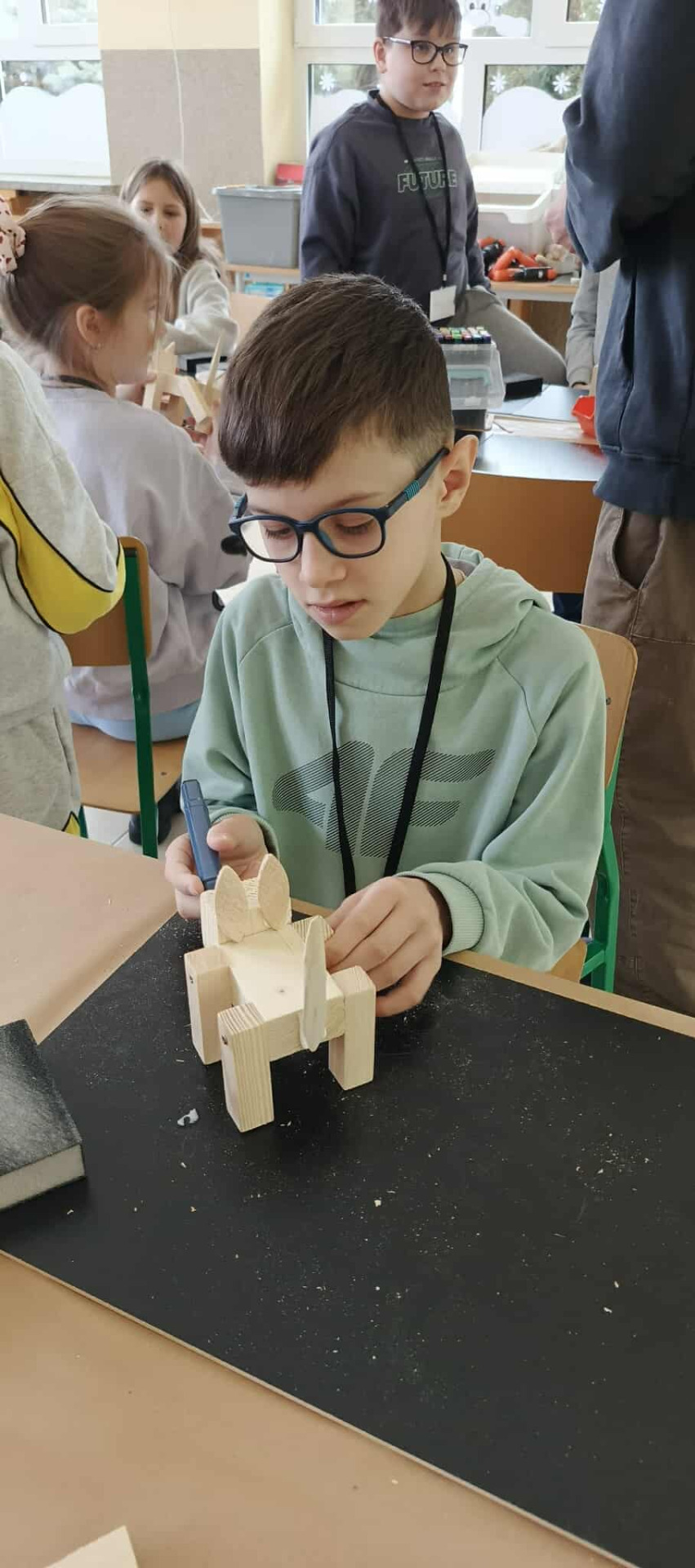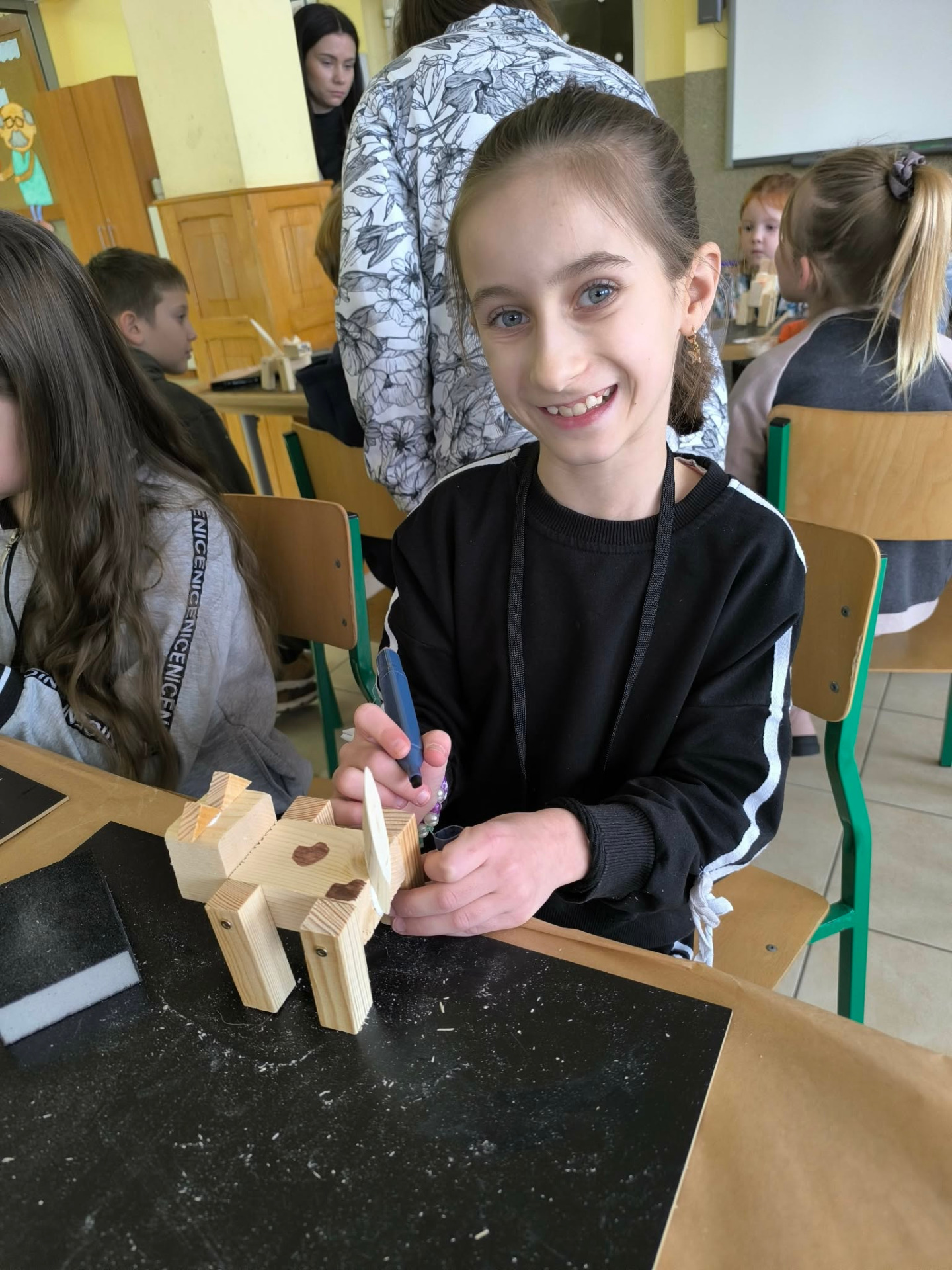W drugiej części warsztatów uczestnicy wzięli udział w zajęciach kreatywnych, podczas których samodzielnie tworzyli z drewna zwierzęta domowe. Dzieci rozwijały wyobraźnię, zdolności manualne oraz uczyły się pracy z naturalnymi materiałami. Powstałe prace były nie tylko estetyczne, ale także stanowiły pamiątkę z zajęć.