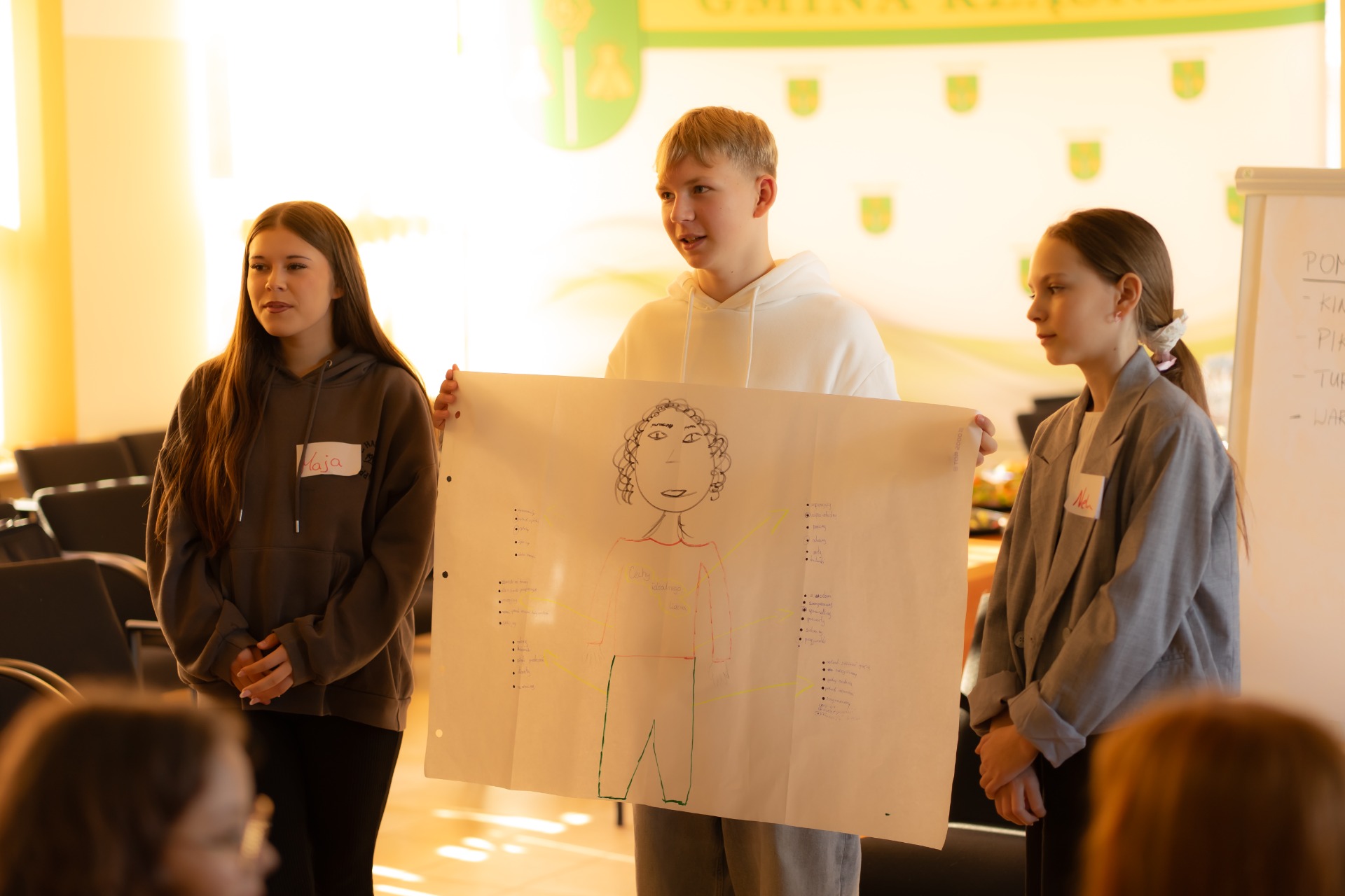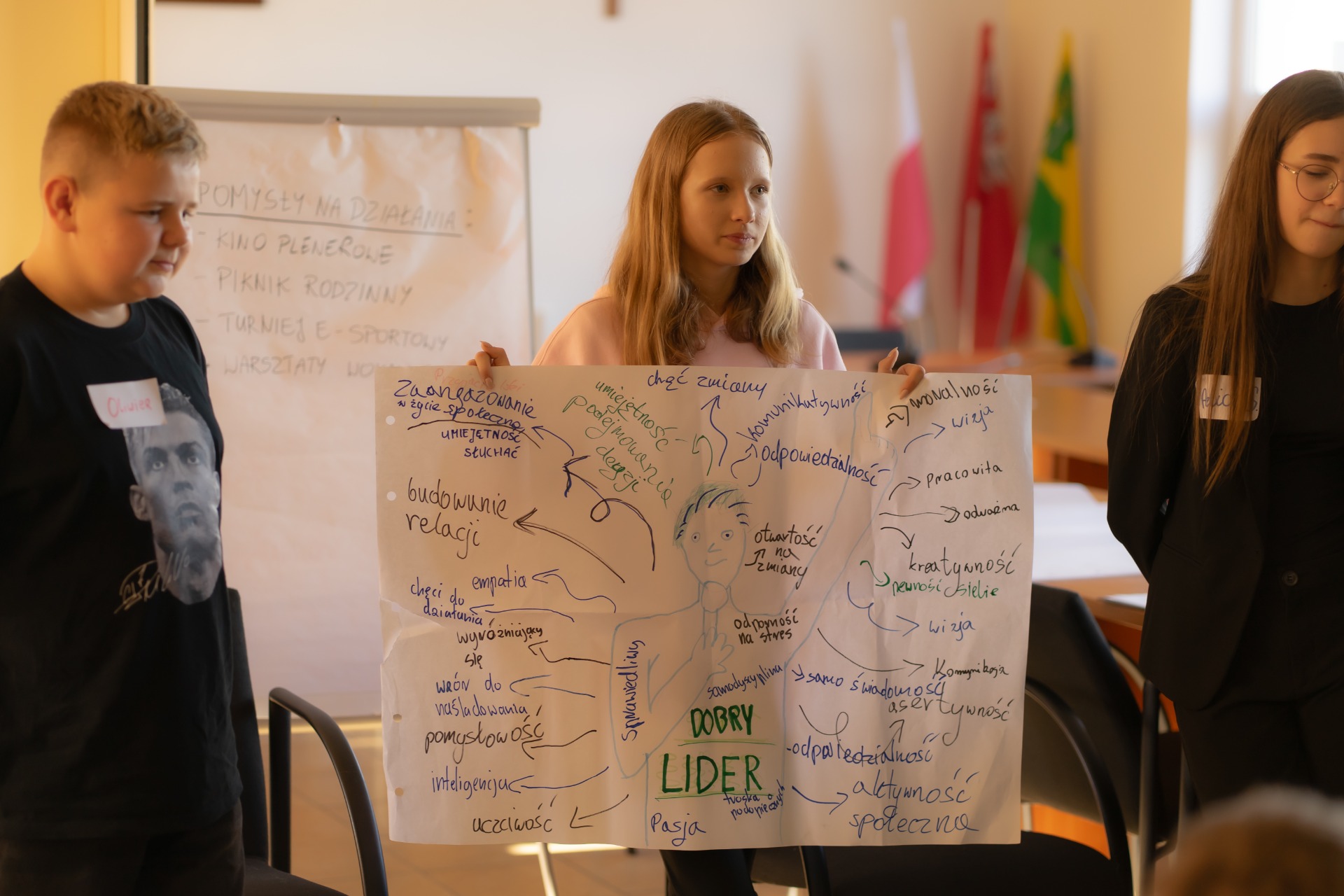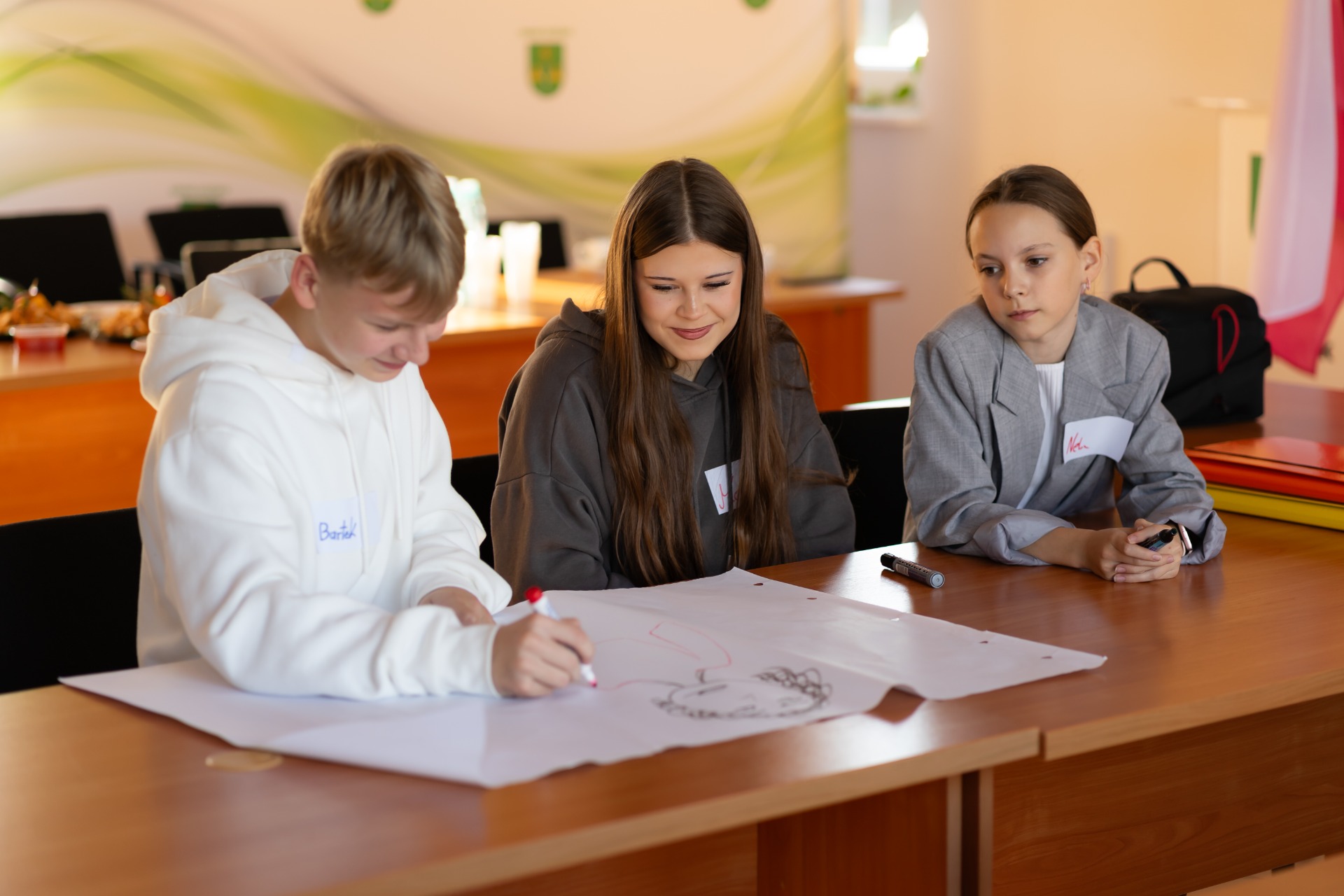 Najpierw młodzi radni wzięli udział w warsztatach rozwijających kompetencje społeczne i samorządowe — pracowali nad komunikacją, współpracą w grupie oraz planowaniem inicjatyw dla naszej lokalnej społeczności.