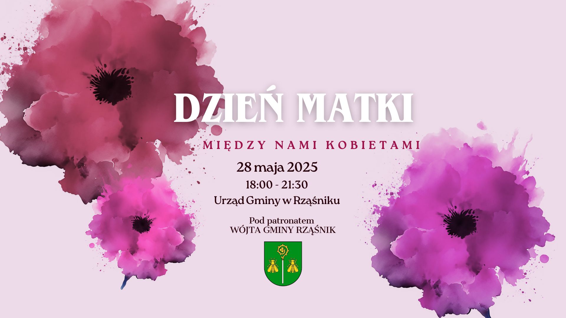 Serdecznie zapraszamy na spotkanie DZIEŃ MATKI- MIĘDZY NAMI KOBIETAMI, które odbędzie się 28 maja 2025 w godz. 18:00 - 21:30 w Urzędzie Gminy w Rząśniku.
