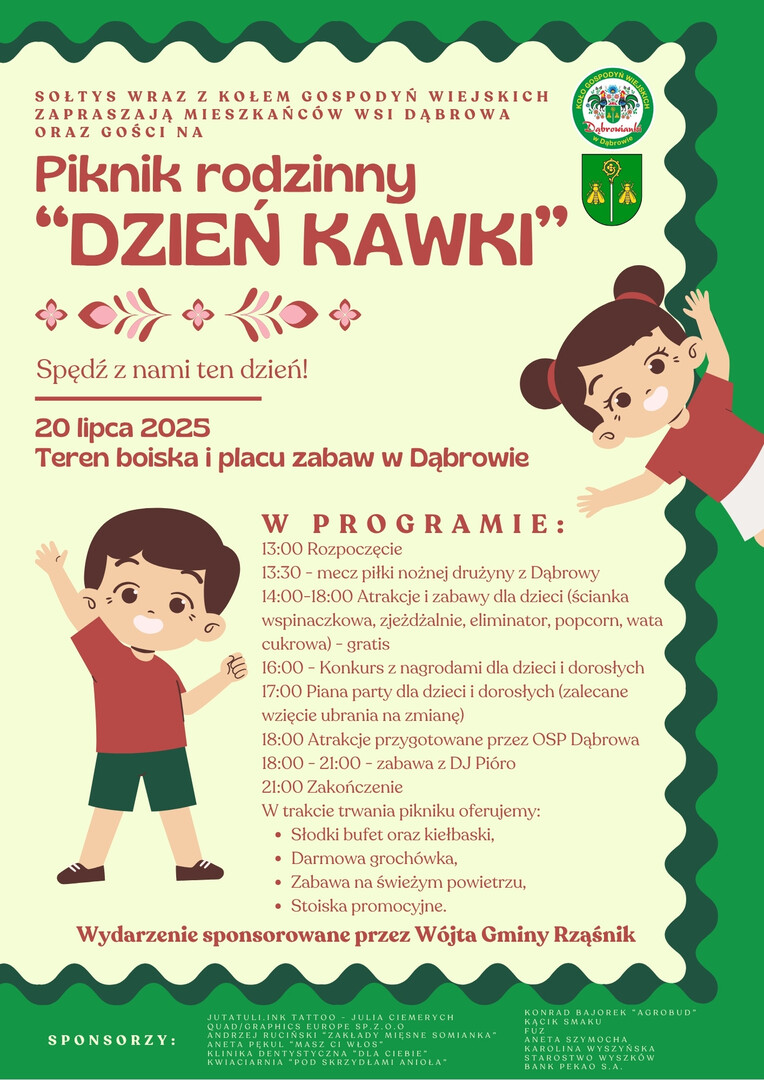 Sołtys wraz z Kołem Gospodyń Wiejskich zapraszają mieszkańców wsi Dąbrowa oraz gości na Piknik rodzinny "Dzień Kawki"